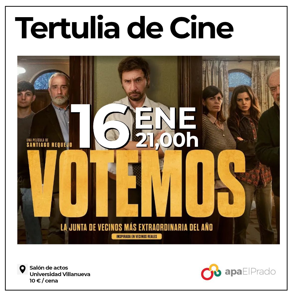 Vie16Ene(Ene 16)21:00Sab17(Ene 17)01:00TERTULIA DE CINE: VOTEMOS21:00 - 01:00 (17) Salón Actos Universidad VillanuevaTipo de Actividad:Cineforum